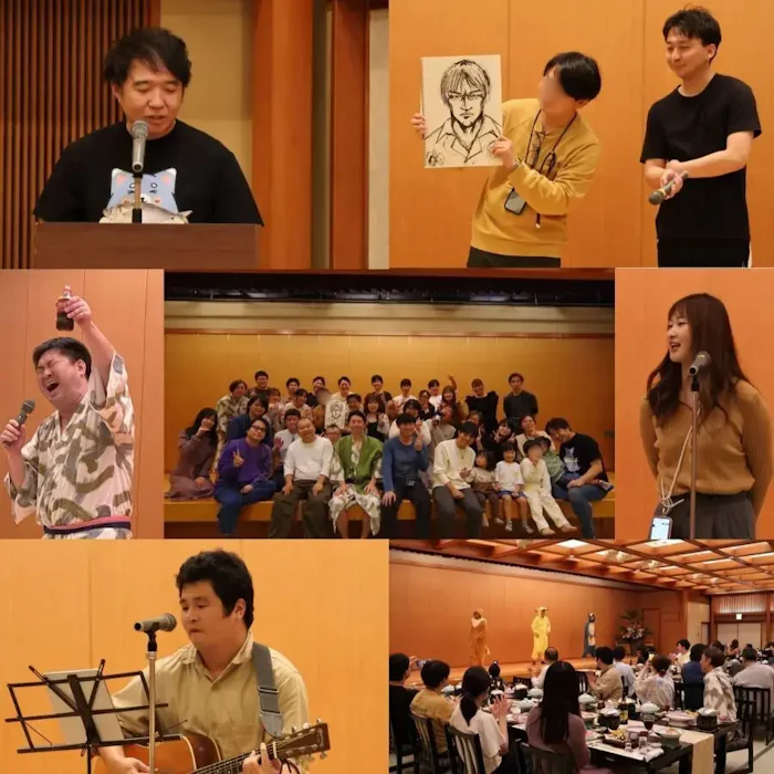 夕食は宴会場にて、取締役の森川の軽快な司会進行で、アーティストたちの一芸が飛び出す宴会が開催されました!